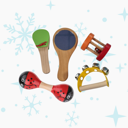 Wooden toys have always been a favourite of ours! Timeless, simple and great for sensory play! This bundle contains an egg shaker, a rattle bell for your baby to shake and make some noise, a wooden mini mirror to see the magic of their reflection, a castanet, and a mini bell roller