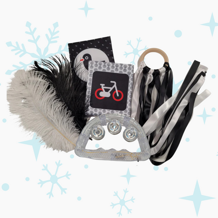 Perfect for younger babies and for exploring contrasts and textures, our Black and White bundle includes: A monochrome ribbon ring, 2 soft baby activity cards, one black and one white feather and a tambourine.