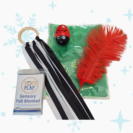 What do you get a baby for their very first Christmas? How about one of our lovely "First Christmas" bundles which contains an egg shaker, a black and white ribbon ring which is great for colour recognition, a sensory foil blanket, a scarf and a feather. All great for those first playtimes, and a variety of things to stimulate different senses!